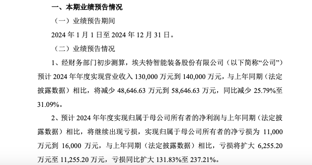 1月24日晚间埃夫特公告称,预计2024年年度实现归属于母公司所有者的净亏损为1.1亿元到1.6亿元。值得注意的是,与上年同期相比,亏损将扩大6255.2万元至1.13亿元,亏损同比扩大131.83%至237.21%。